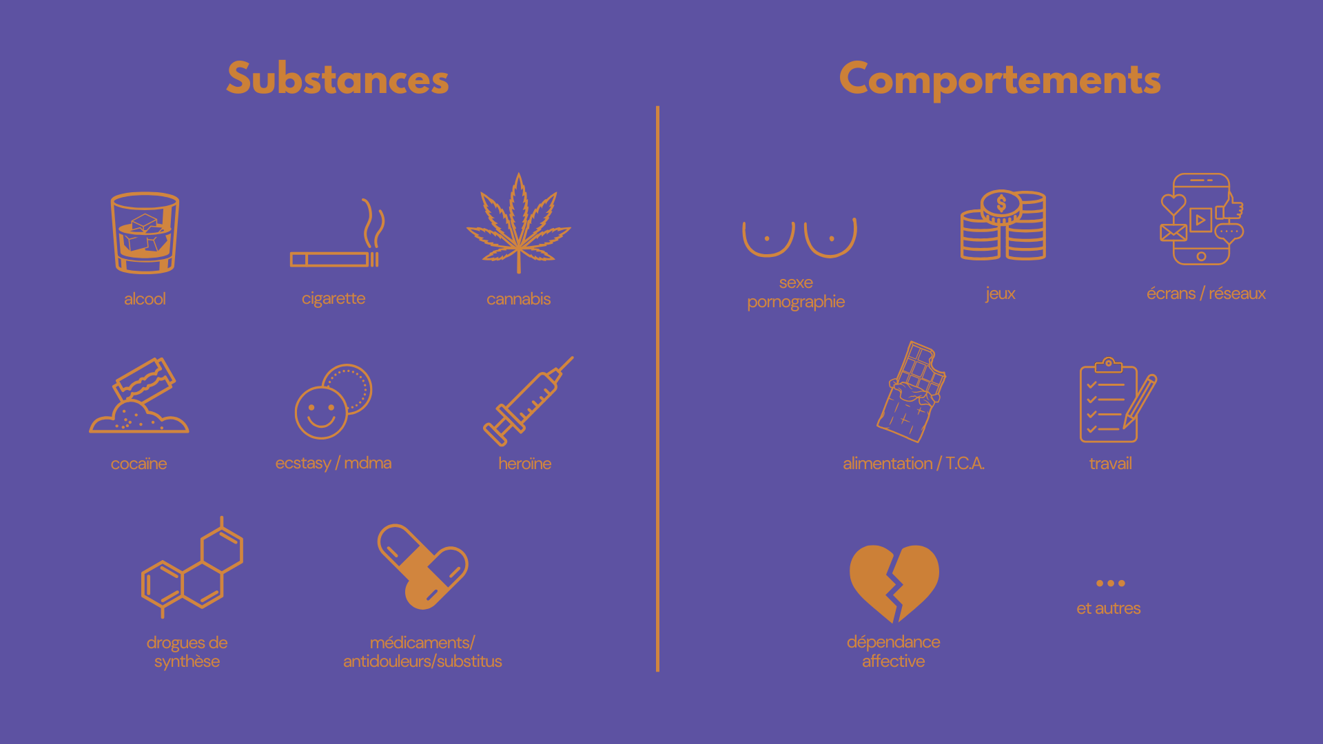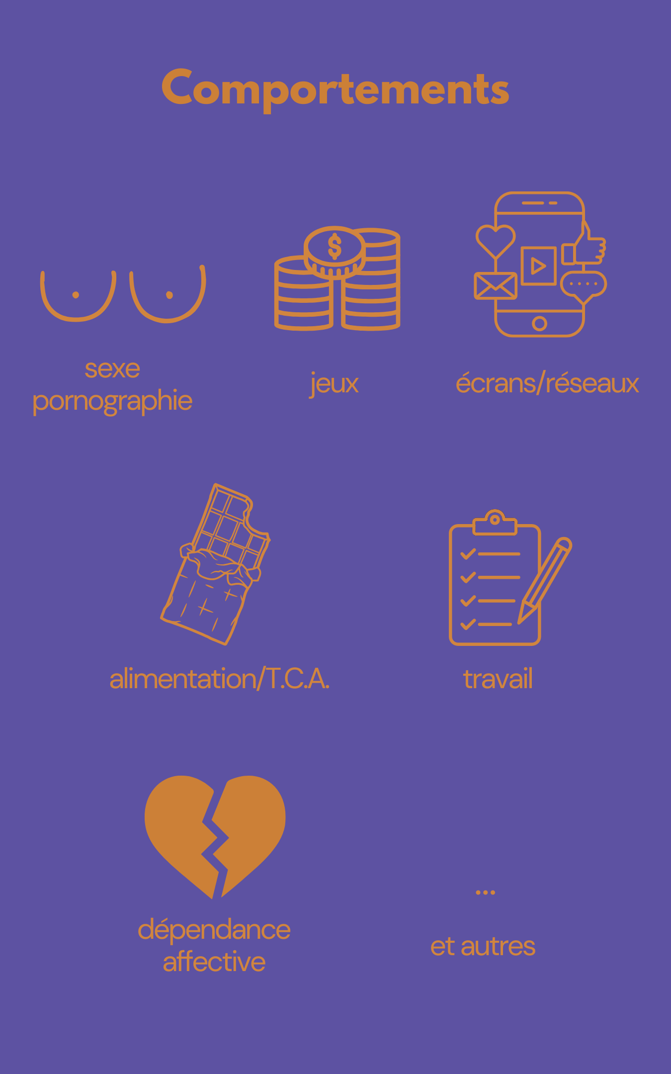 - les addictions comportementales (jeux, écrans, sexualité, travail, alimentation, etc.),