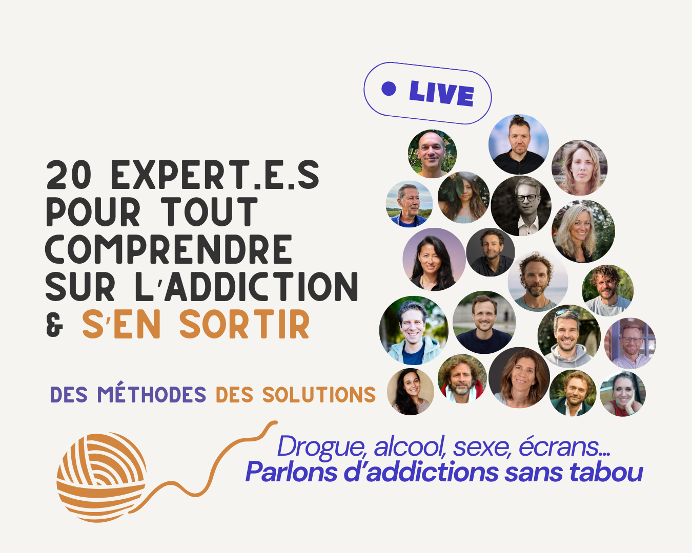 Pendant 6 jours nous allons décortiquer ensemble le sujet des addictions, en comprendre les racines profondes, étudier la mécanique psychologique, et surtout découvrir ce qui fonctionne pour s’en libérer. 6 jours de conférences avec un panel d’experts qui vont te faire découvrir et expérimenter des pratiques en live. 6 jours transformateurs pour t’inspirer et te donner l’élan pour te libérer de tes dépendances.